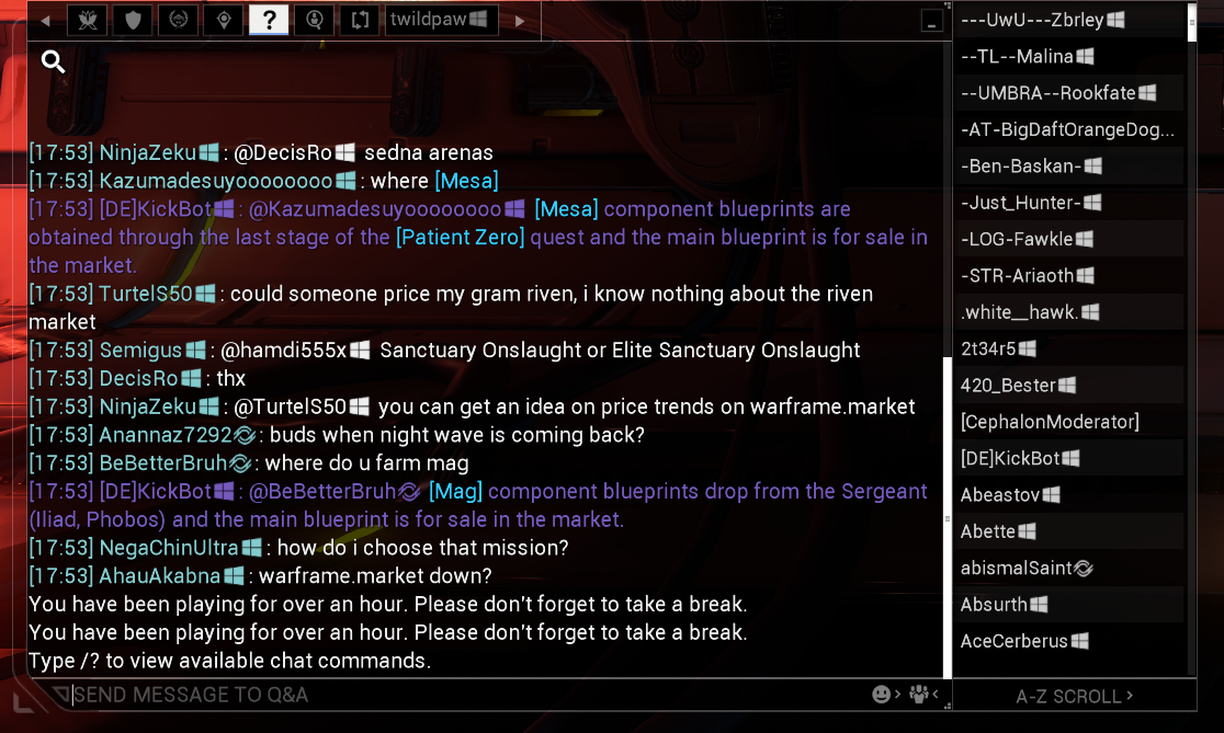 So! You just found chat. The thing in the bottom left you use to communicate with other Tenno. First things to know! T is the standard toggle and you can also move the window to wherever you want with your mouse. You can also resize this at any time